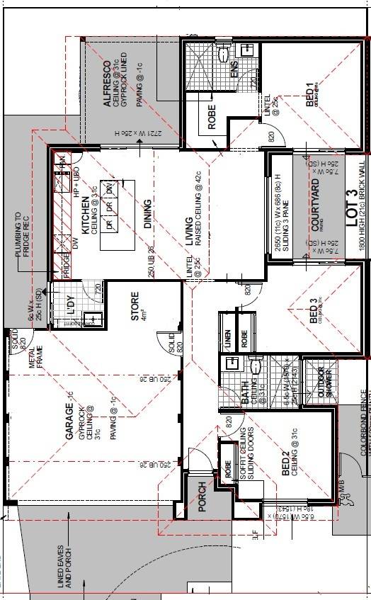 The floorplan has been meticulously designed and includes 3 bedrooms, 2 bathrooms, double lock up garage, private courtyard for the masterbedroom, walk in robe to masterbedroom, an outdoor shower and a luxurious 42c ceilings in the living and dining. To put things in perspective, 31C ceiling is considered "high ceilings"