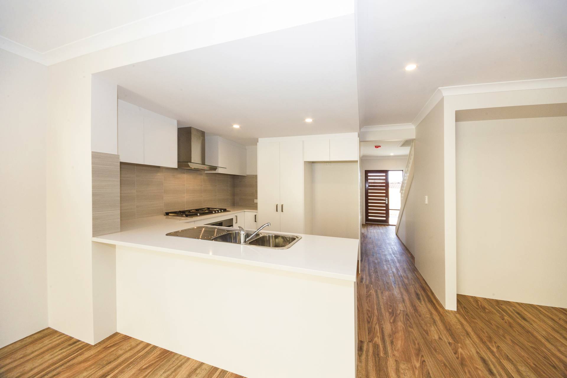 Spacious open plan kitchen, with a U-shaped stone benchtop and overhead cabinet.