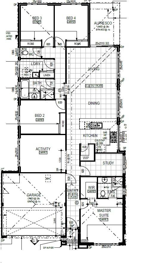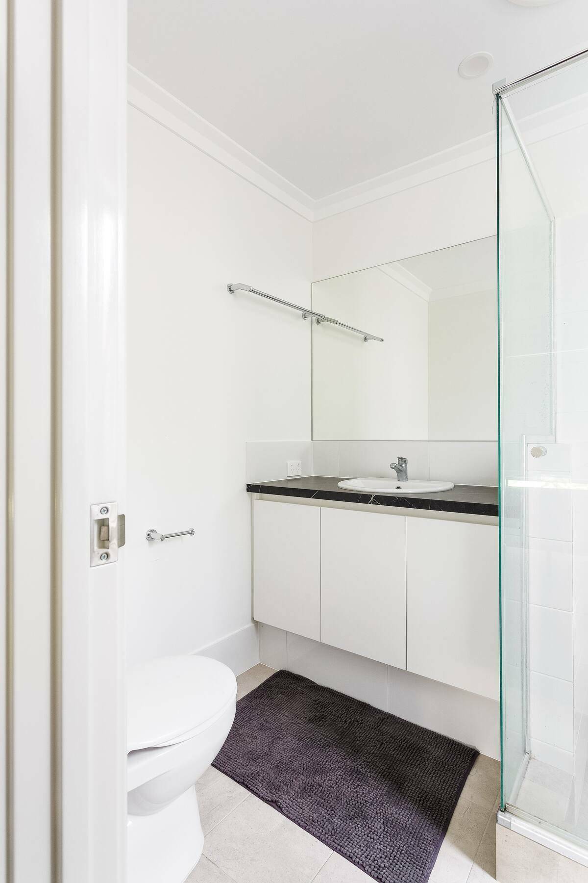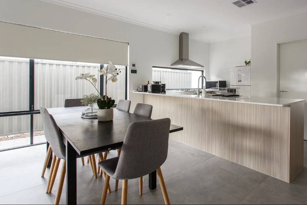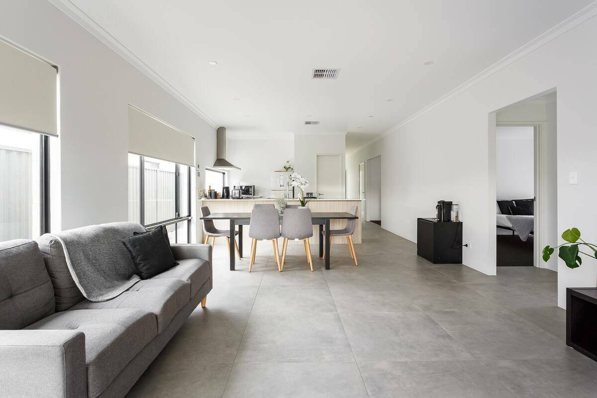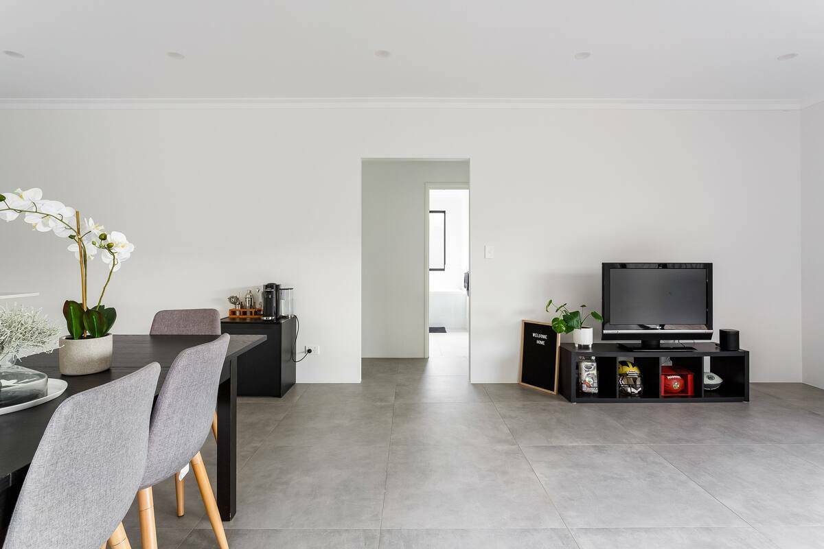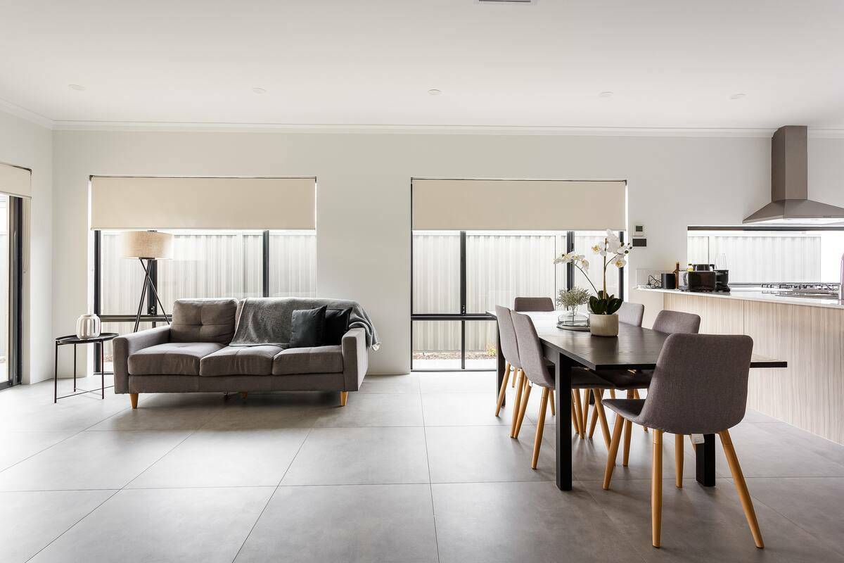 The open plan dining and living area includes large format tiles whilst the bedrooms and study features carpets.