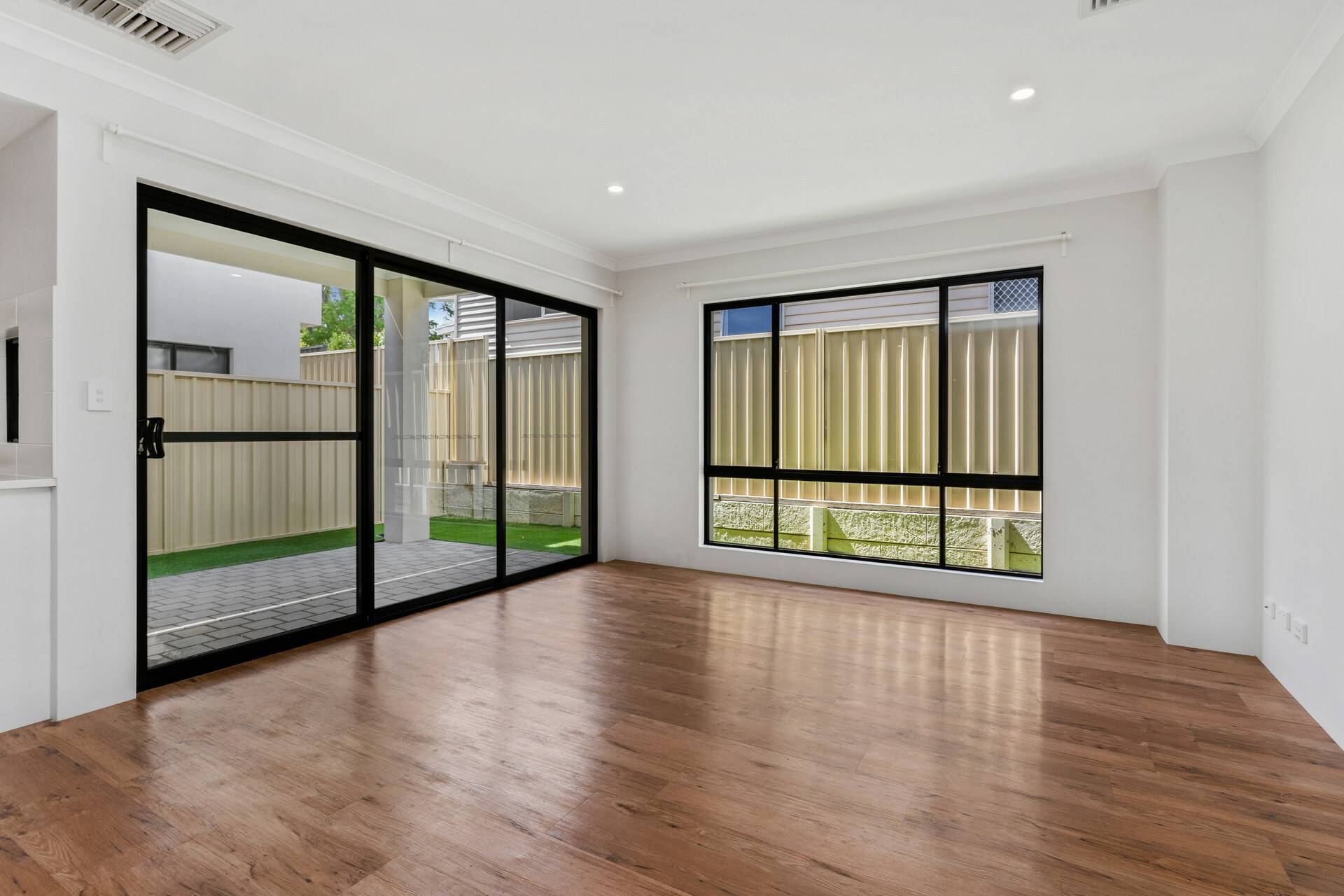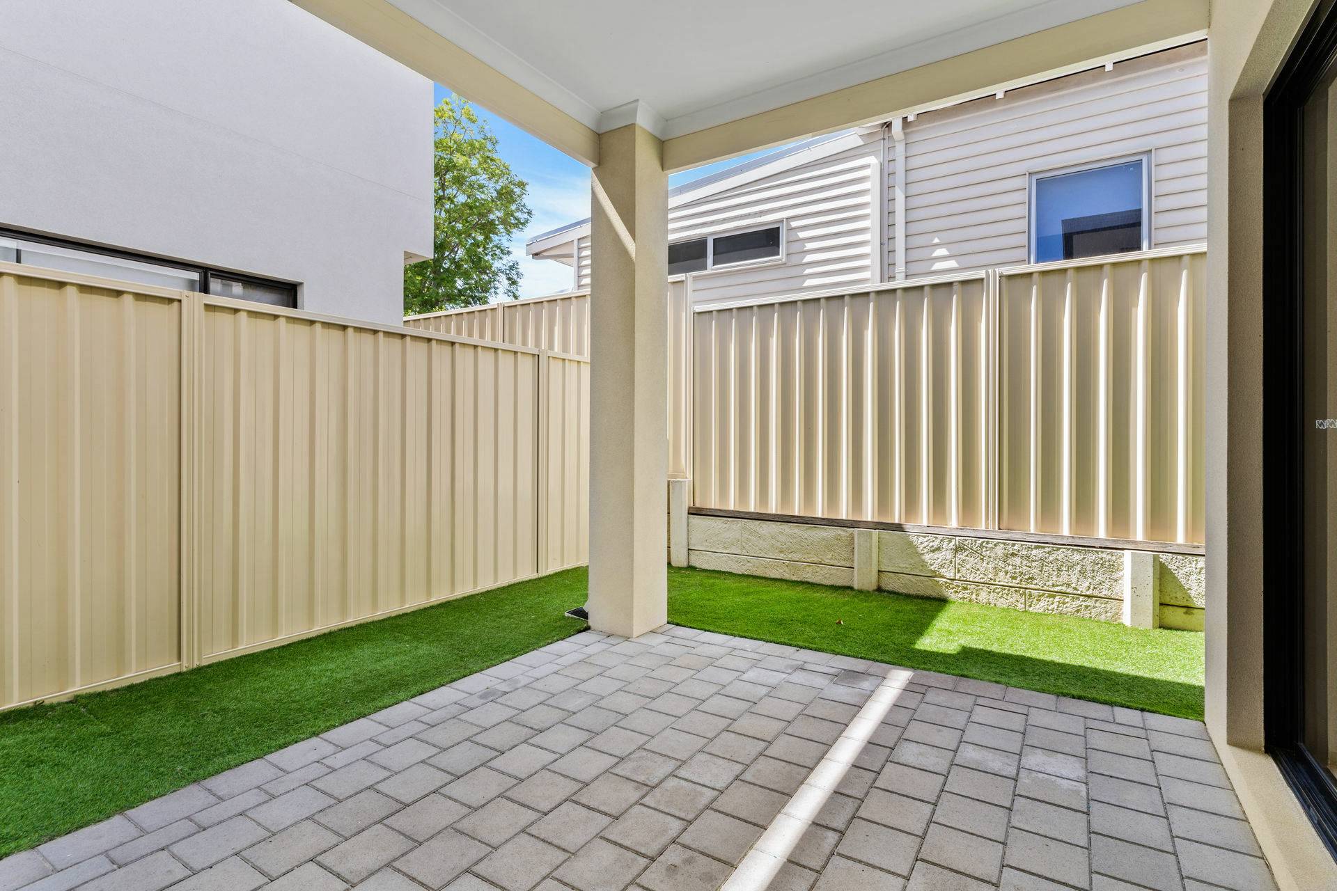 The under cover alfresco is low maintenance featuring a mixture of brick paving and artificial grass.