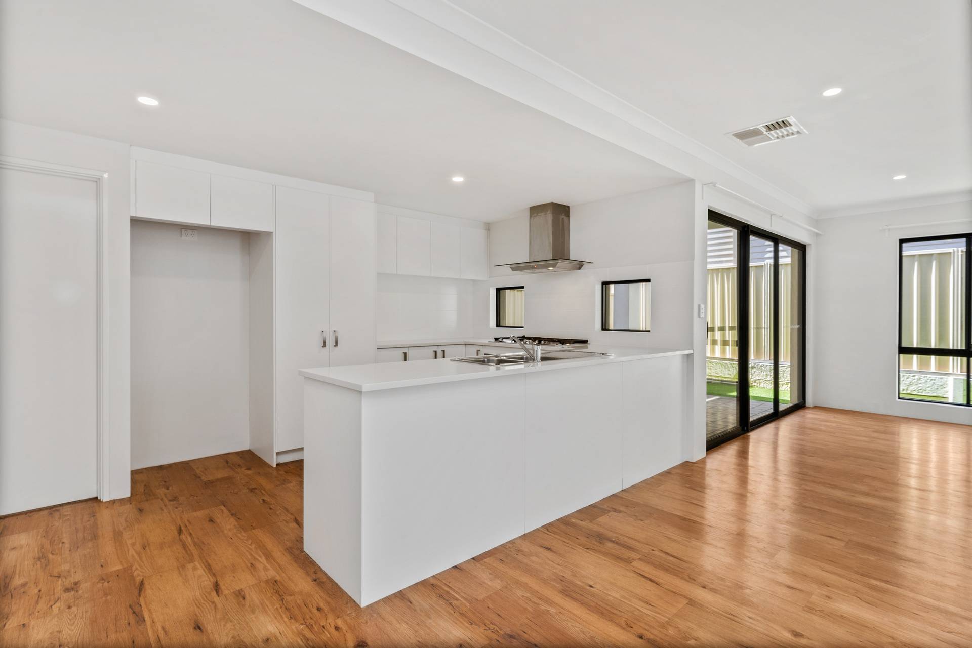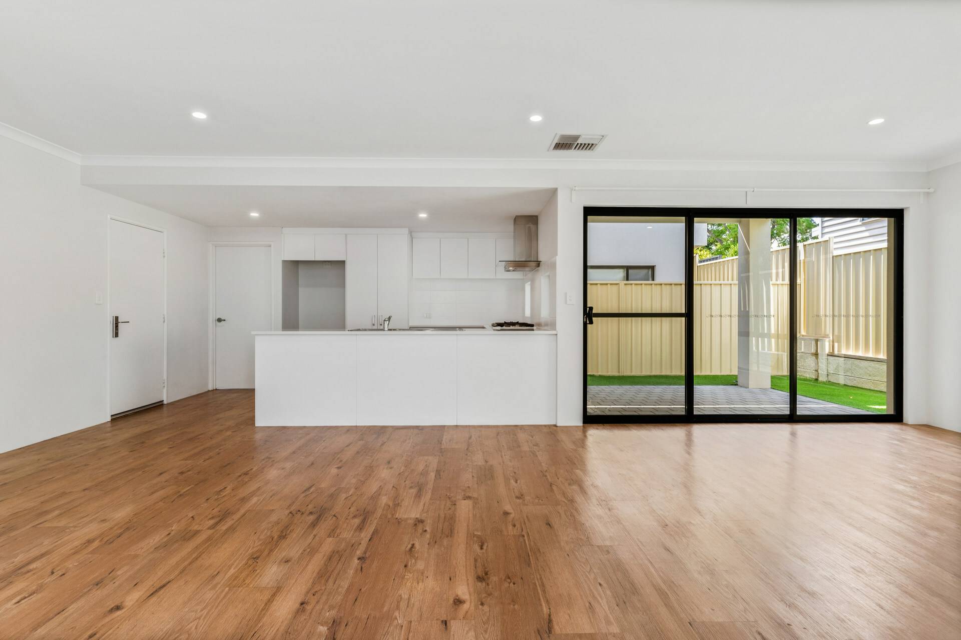 On the ground floor, there is an open plan living, dining and kitchen with a bonus carpeted theatre room