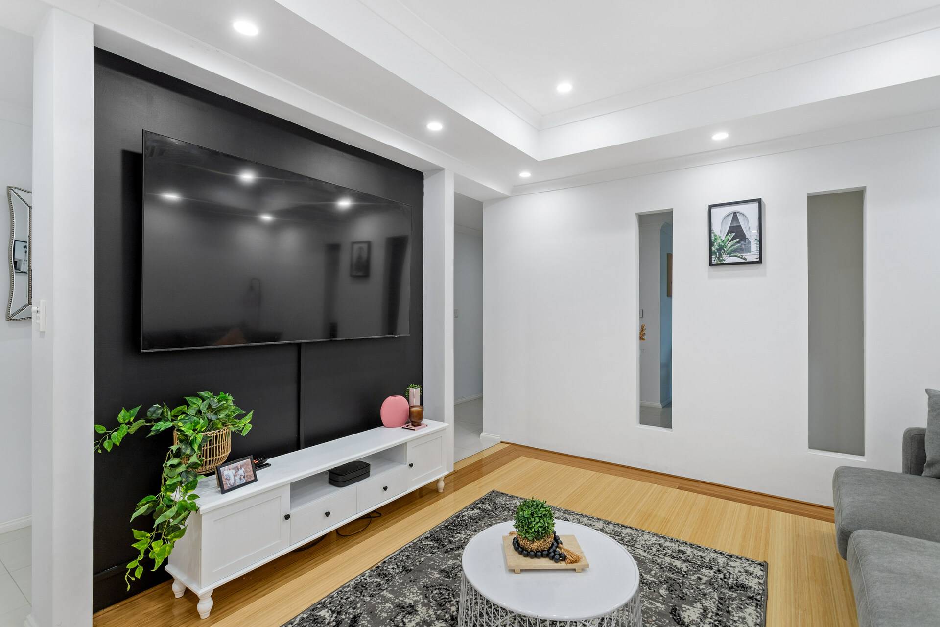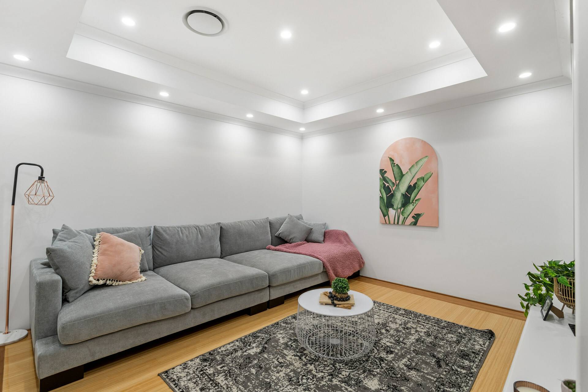 Theatre room illuminates with a string of LED downlights and boasts a coffered ceiling