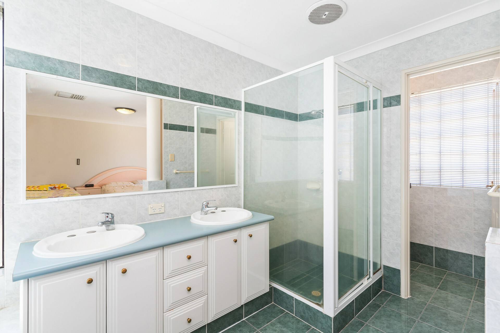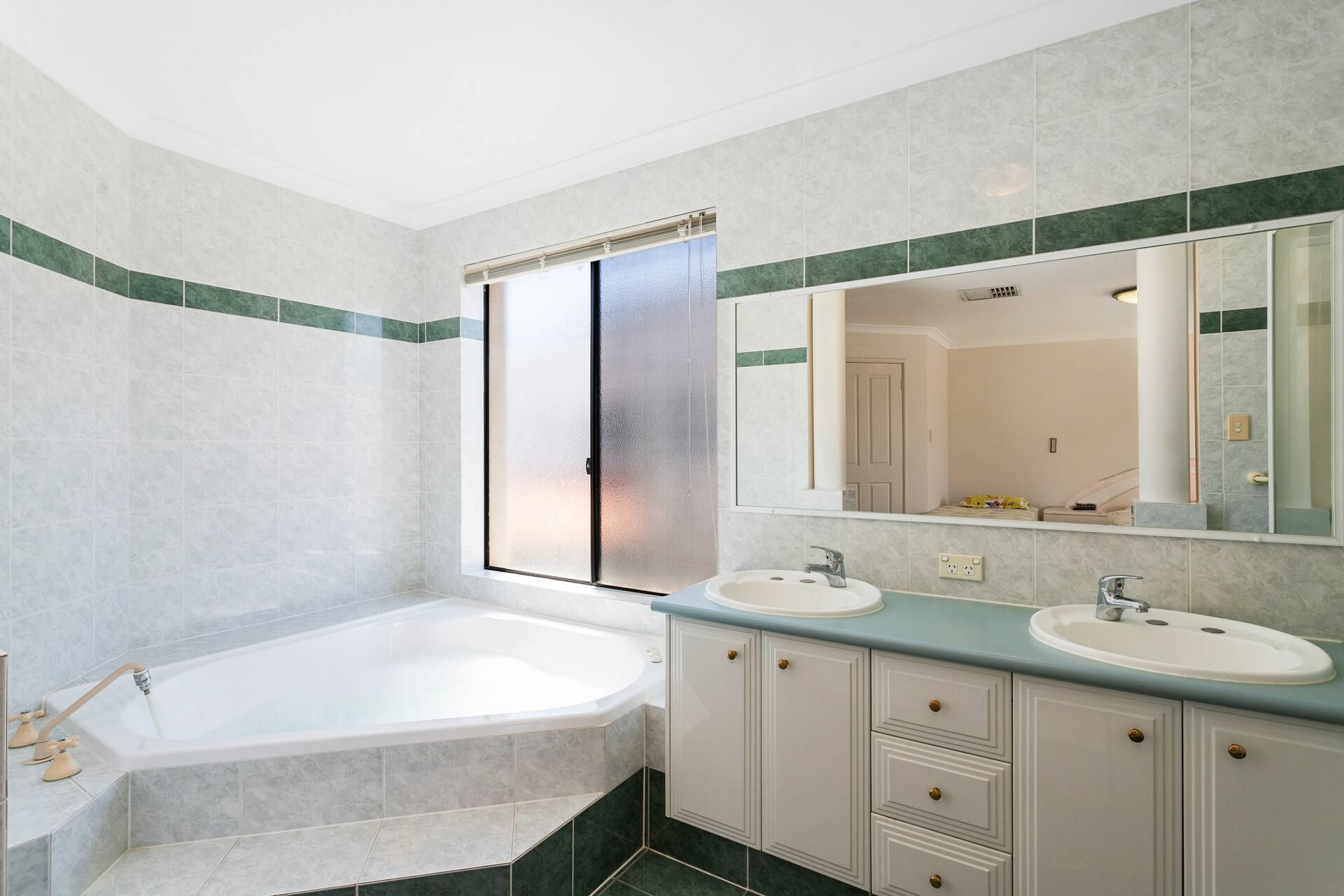 The connecting ensuite bathroom has a spa bath and his & hers hand basins