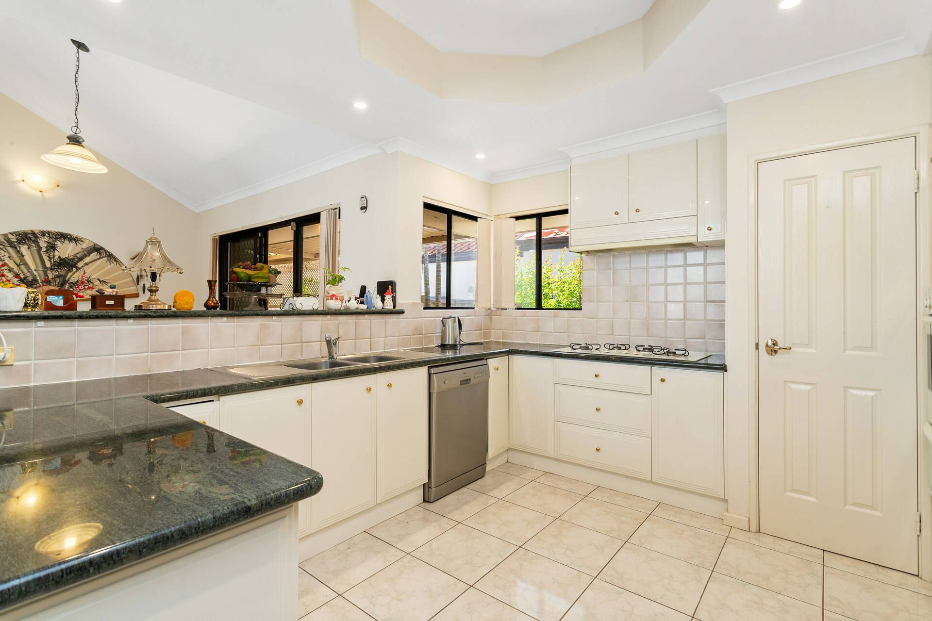 Massive U-Shaped Kitchen with walk in pantry, feature ceiling, dishwasher & ample benchtop space & cabinetry