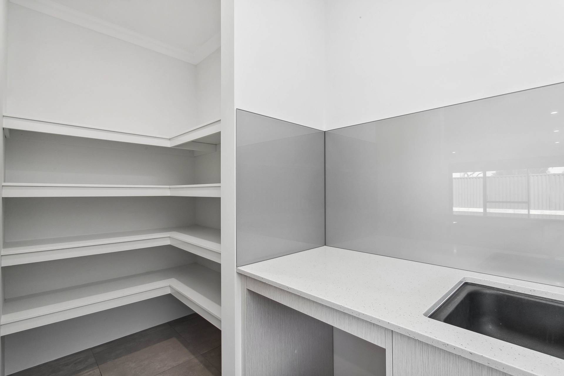 The kitchen includes stone benchtops, glass splashback, overhead cabinets, multiple sinks, a scullery and a huge walk in pantry with a fixed window that allows natural light to illuminate the room
