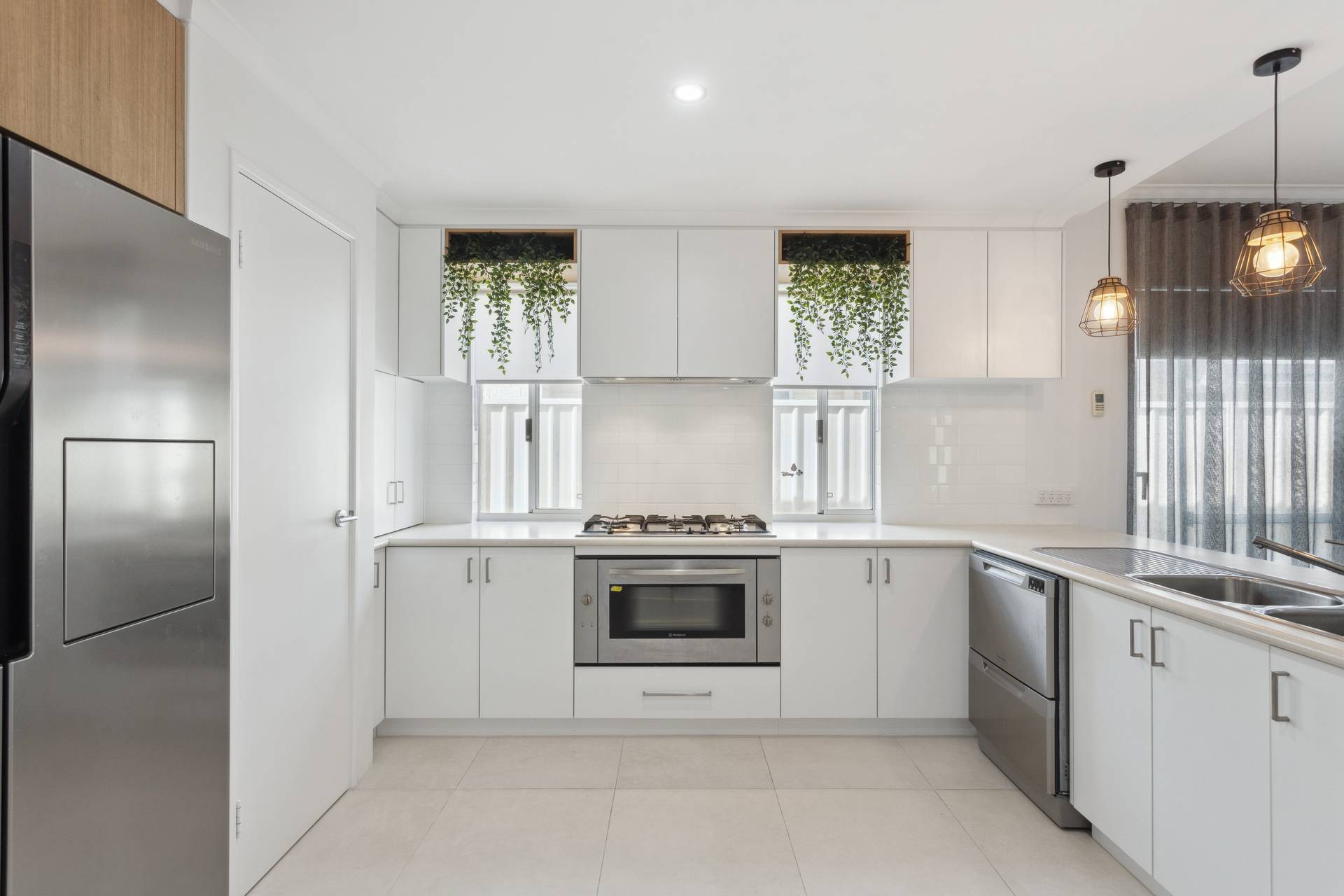 • Chef’s Kitchen – a culinary dream with a dishwasher, pendant lights, breakfast bar, hidden microwave recess, overhead cabinets, built-in pantry, and two windows that flood the space with natural light.